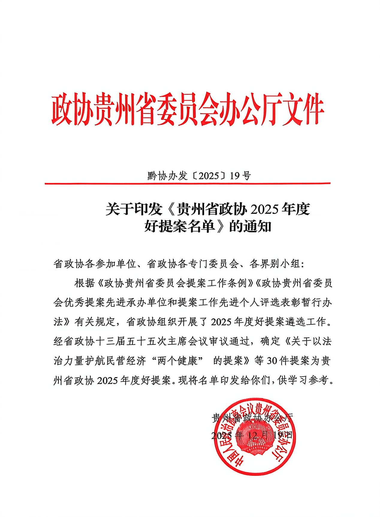2025年12月19日,贵州省政协发布《关于印发贵州省政协2025年度好提案名单的通知》(黔协办发〔2025〕19号),根据《政协贵州省委员会提案工作条例》《政协贵州省委员会优秀提案先进承办单位和提案工作先进个人评选表彰暂行办法》有关规定,省政协组织开展了2025年度好提案遴选工作。民建贵州财经大学支部潘文富教授撰写的《关于加快数字金融发展 推动贵州数字经济发展创新区建设的提案》(提案号1020),获评“贵州省政协2025年度好提案”,其研究成果同步获得相关部门采纳。
